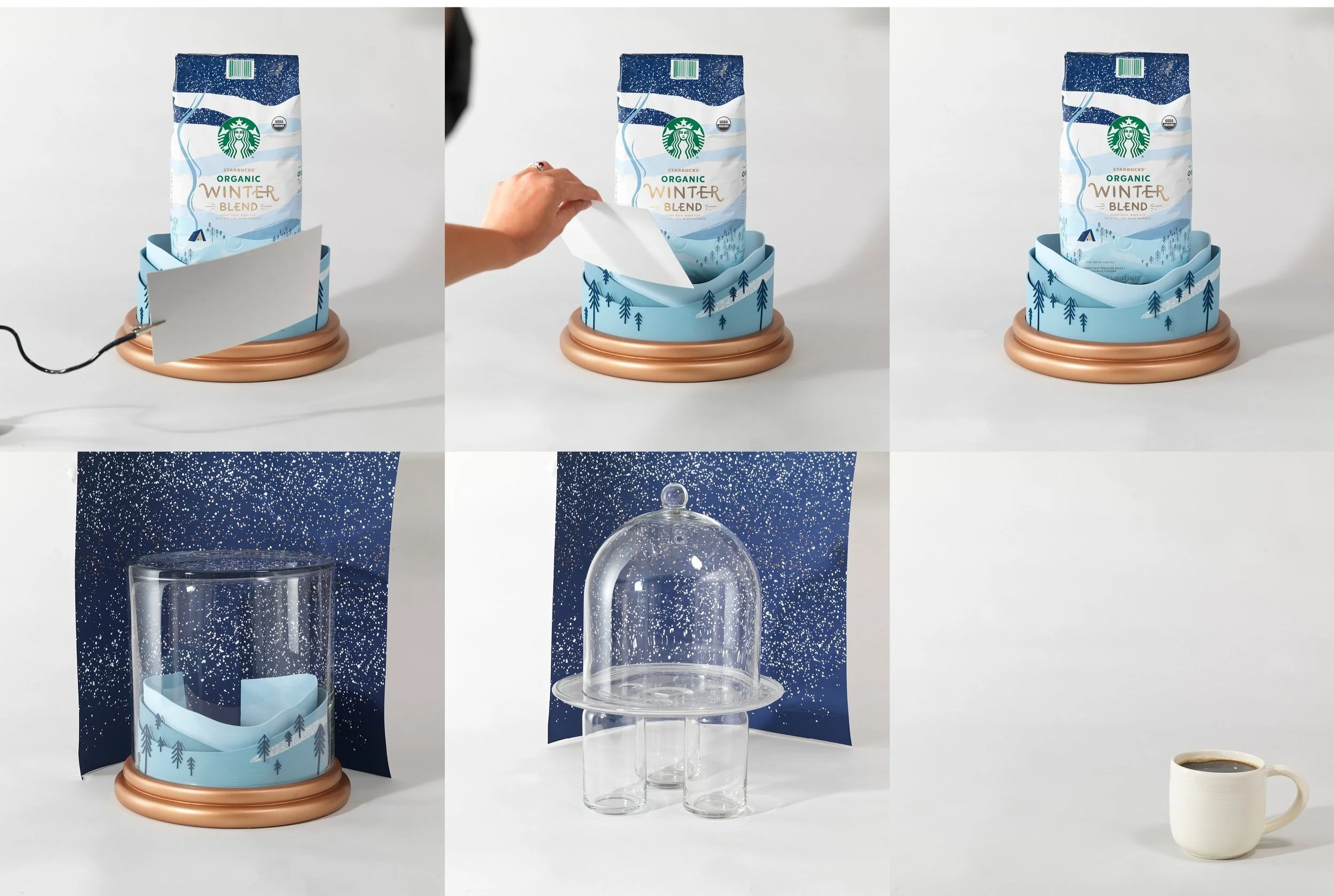 Print ads expanding the world of Winter Blend’s evolving packaging into a magical, three-dimensional snow globe (2021) and mountain range (2022).